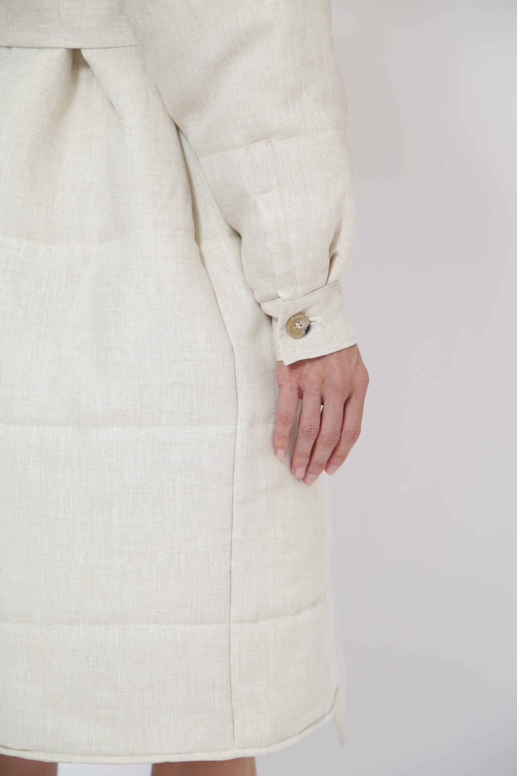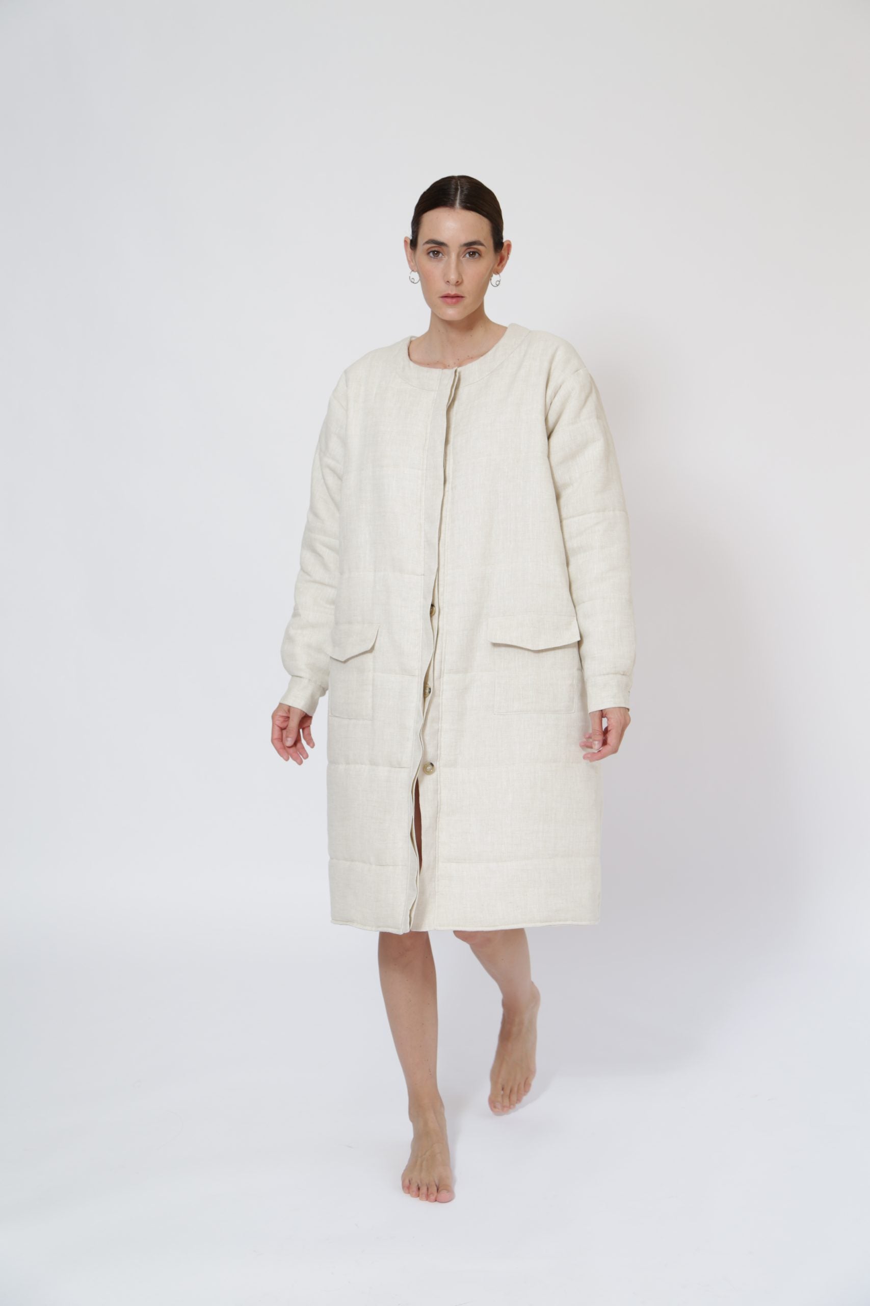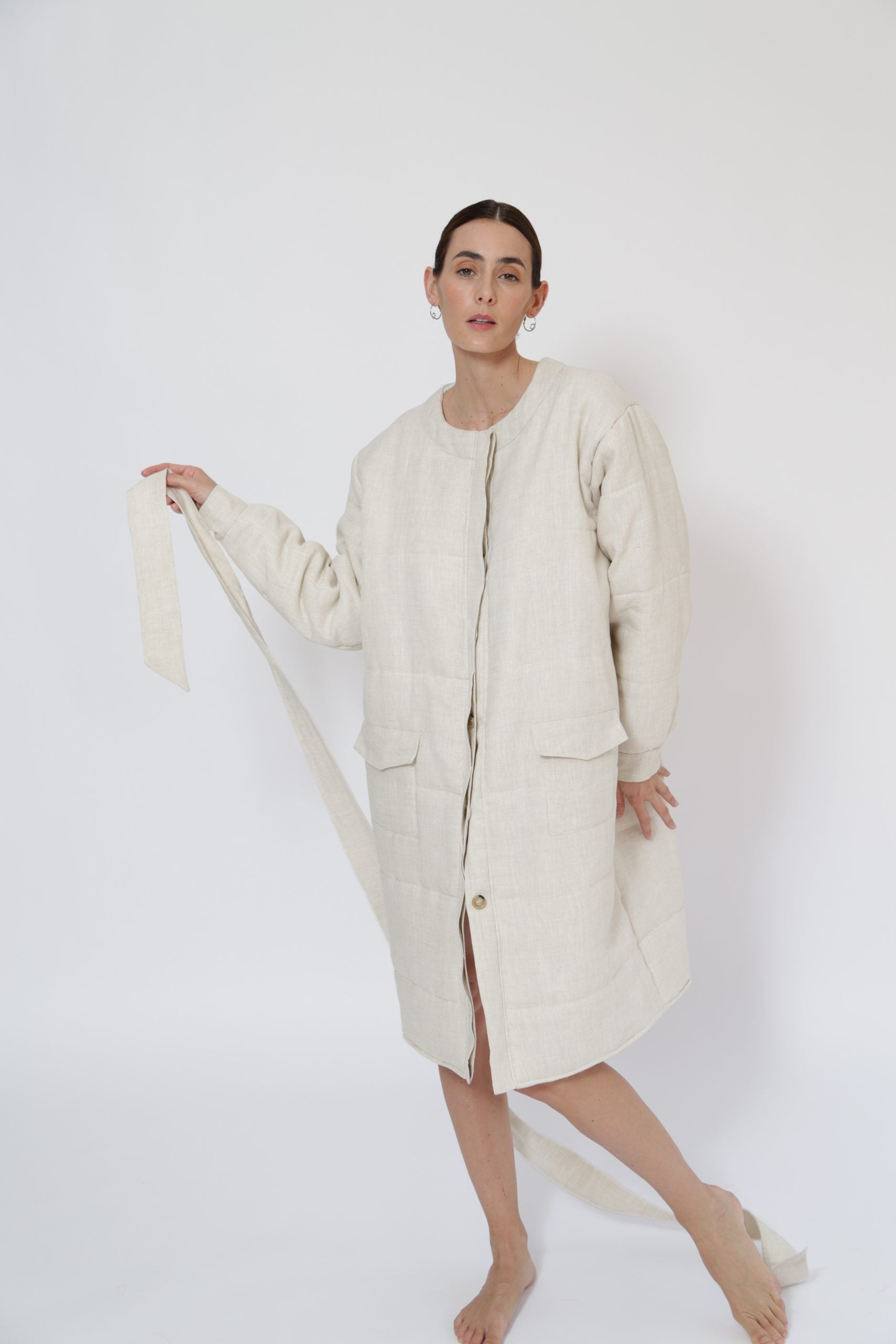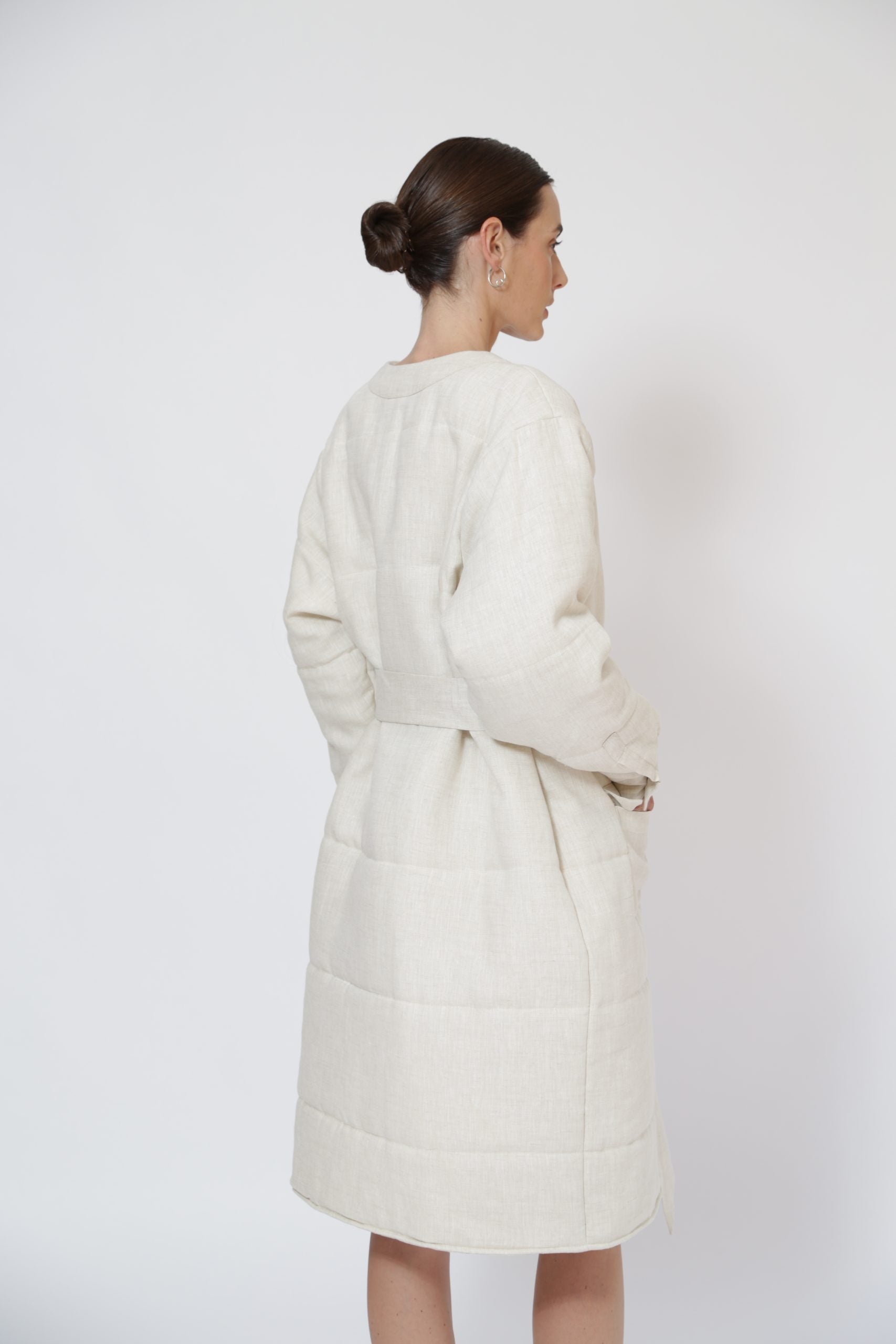 Abrigo Artemisa de lino acolchonado que combina elegancia y comodidad para un look refinado. Su cinturón es extraíble y permite ajustar la silueta con facilidad. Cuenta con dos bolsillos a los laterales que añaden funcionalidad sin perder el estilo.