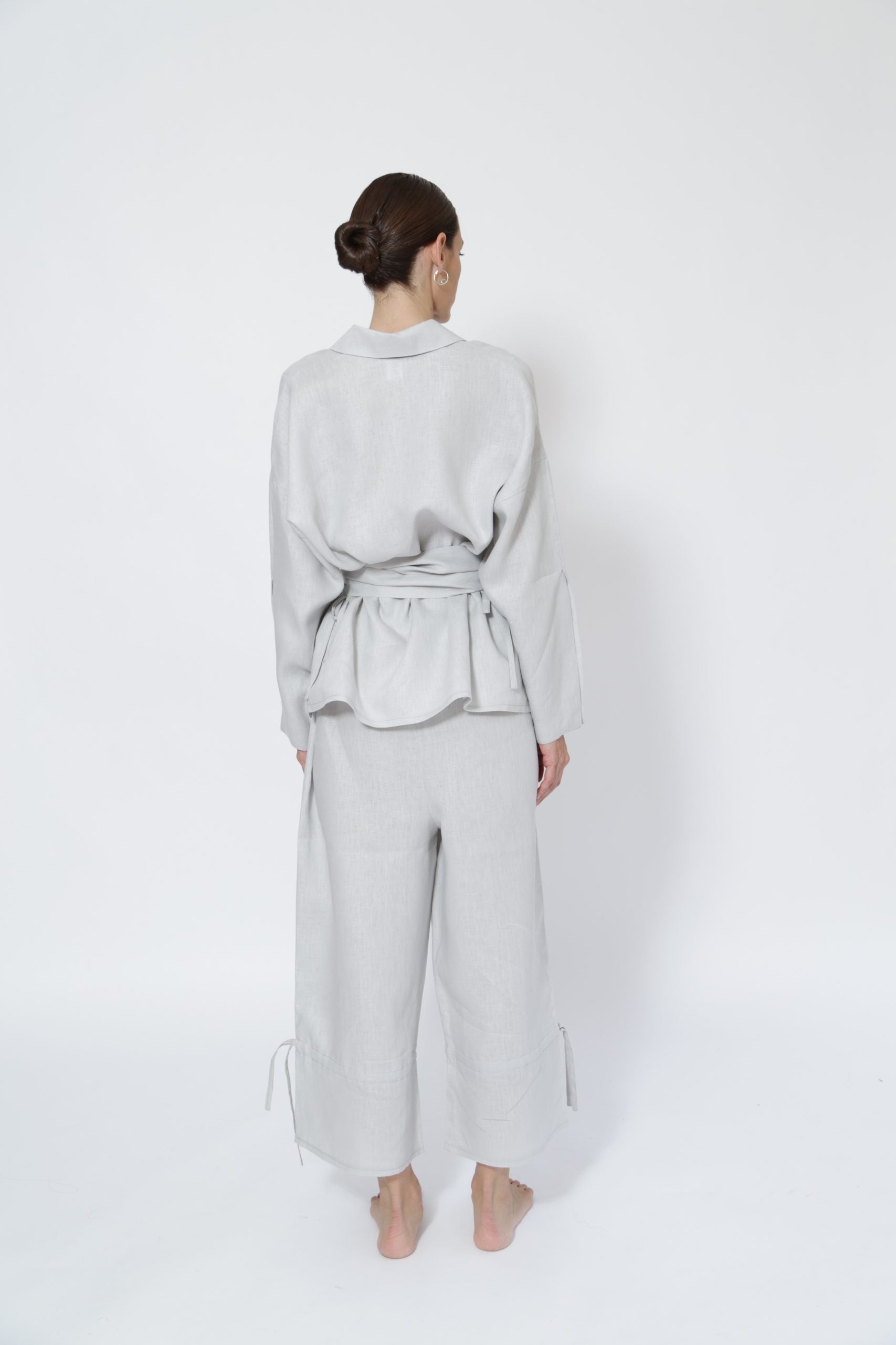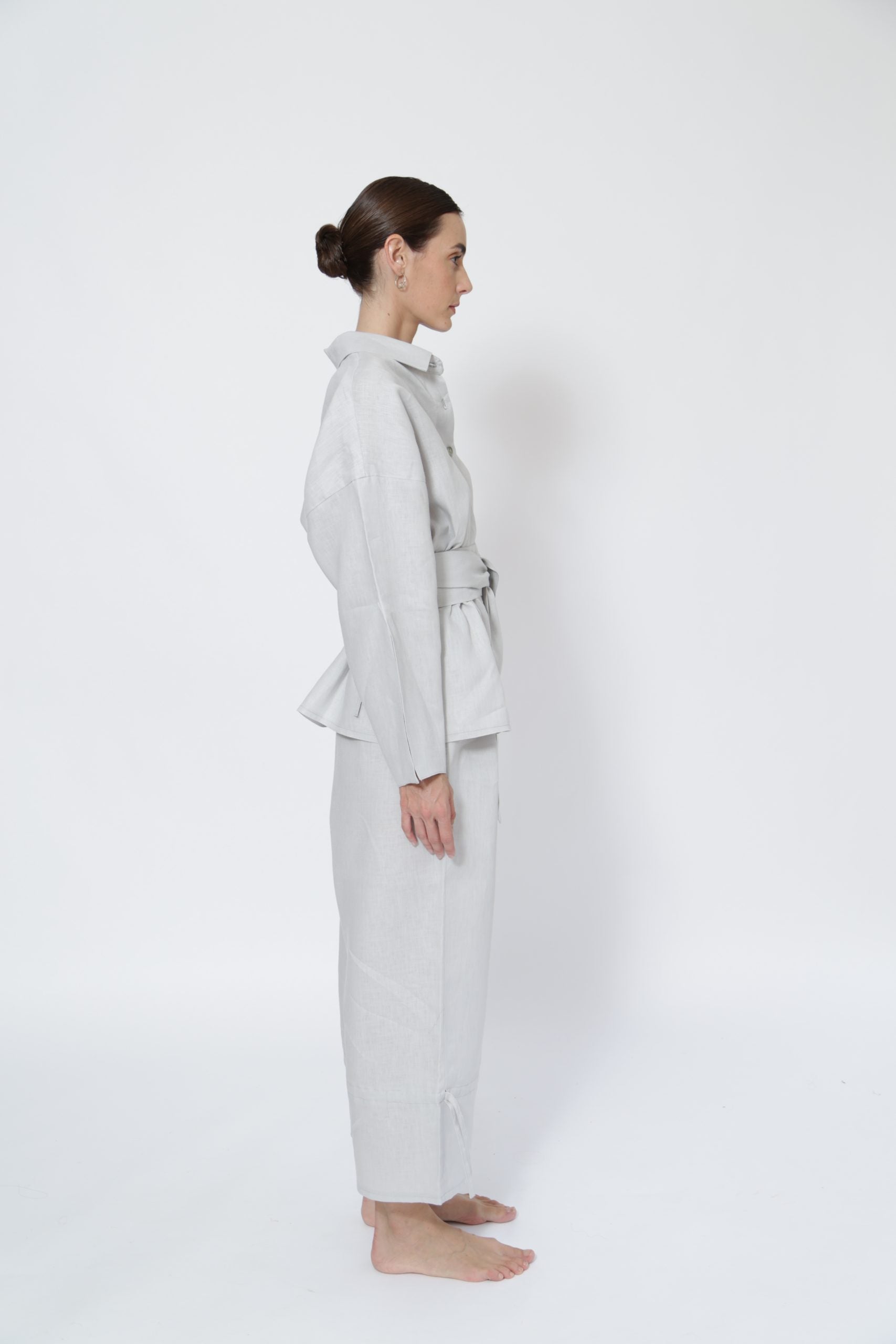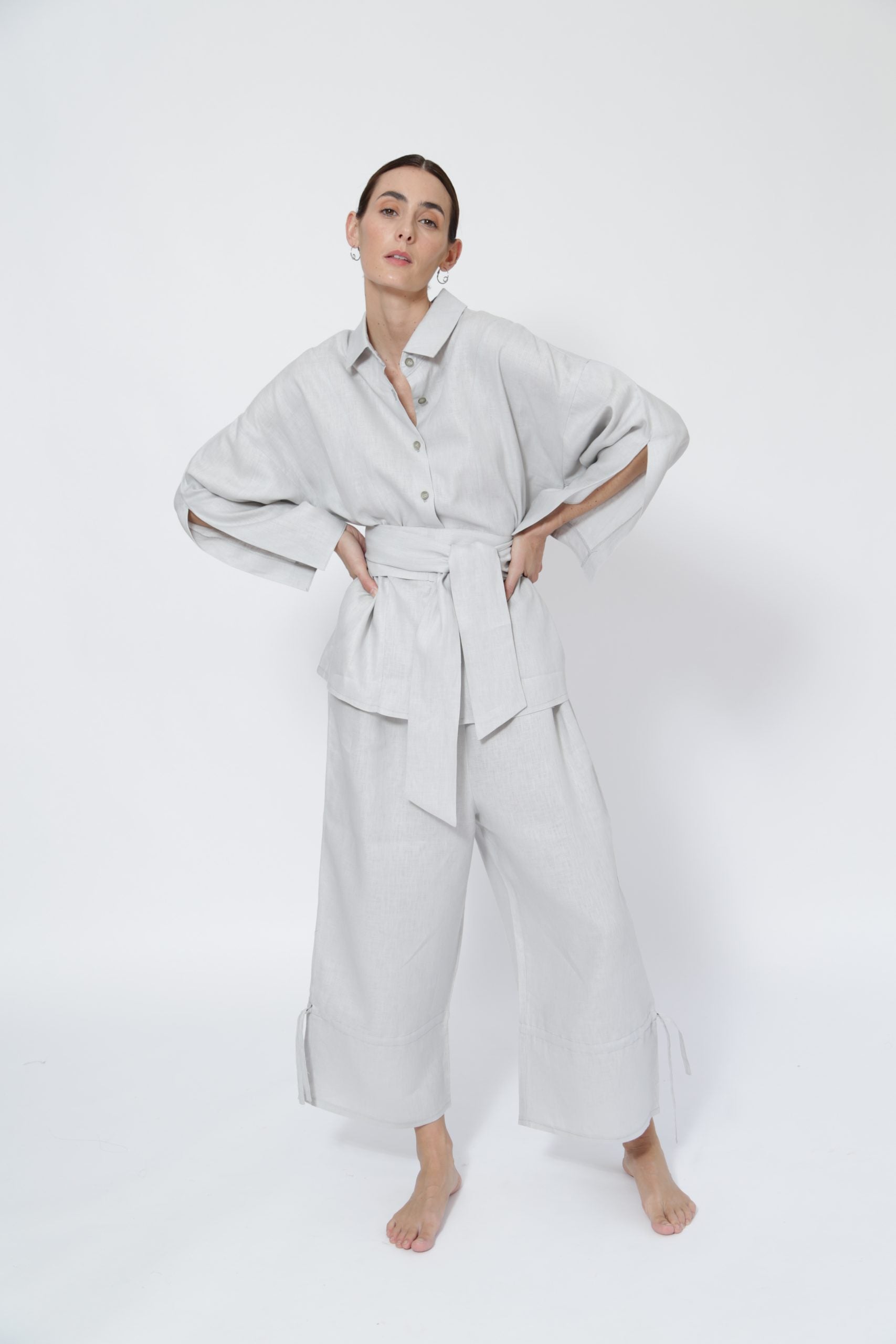 Camisa de botones con jaretas ajustables en costados con cinturón fajín ajustable con lazadas / extraíble.