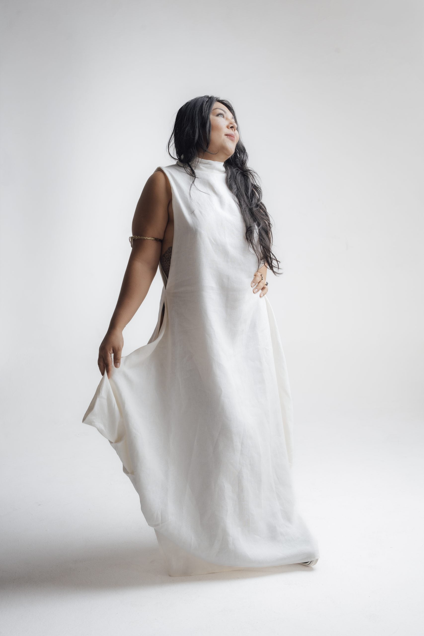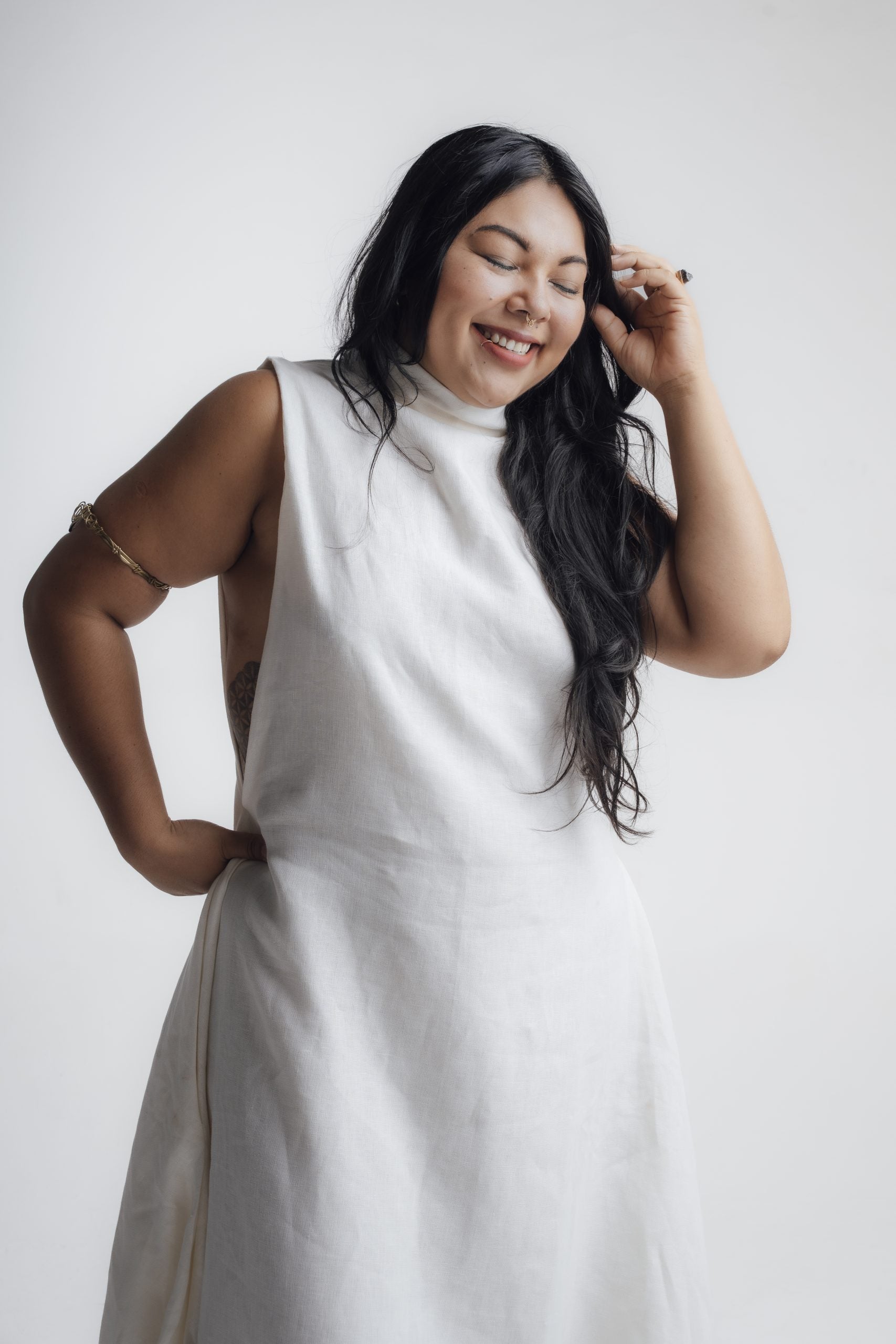 La modelo en Vestido Simone Sand mide 169cm/5'6" y está usando una talla 2.